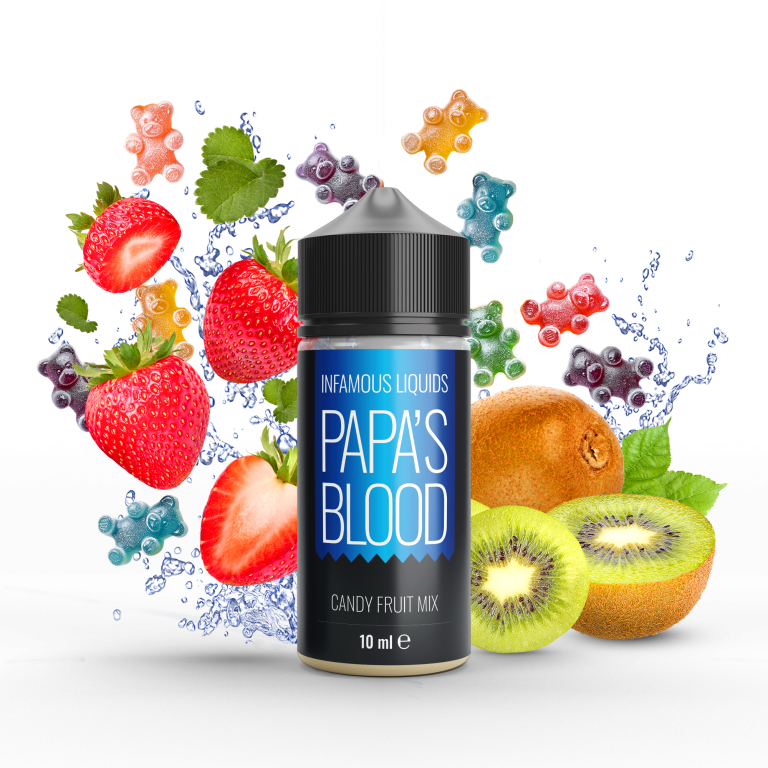 Papas Blood un superventas y uno de los primeros aromas de la marca Infamous. Data de 2013 y sigue manteniendo su receta original, destacando por su carácter único. La combinación de caramelos tipo gummy, fresas jugosas y kiwi ácido crea una mezcla perfectamente equilibrada.