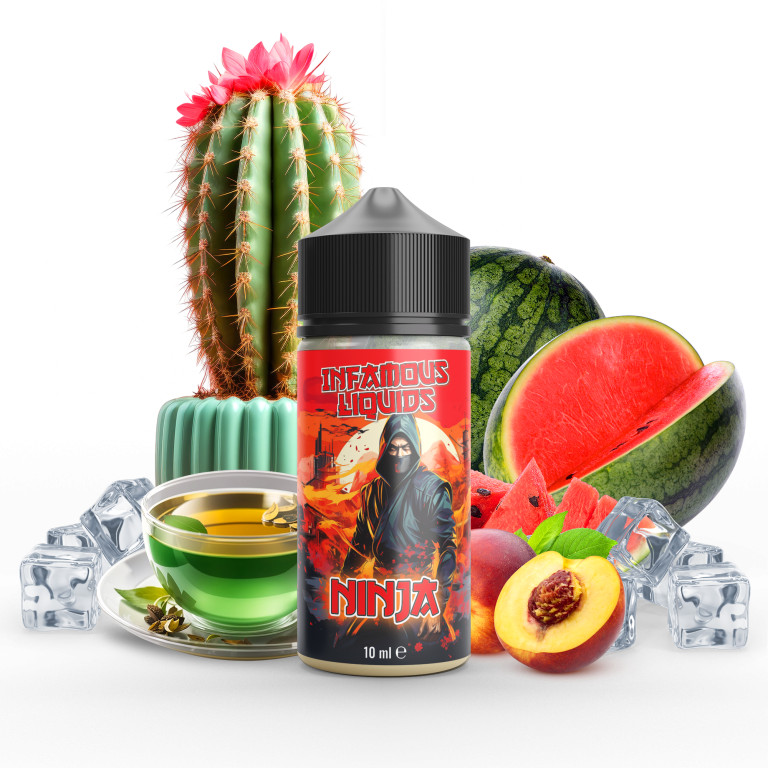 Ninja Juice uno de los aromas más emblemáticos de la serie. La mezcla de cactus, sandía, melocotón y té verde, acompañada de un toque refrescante, crea un perfil perfectamente equilibrado.